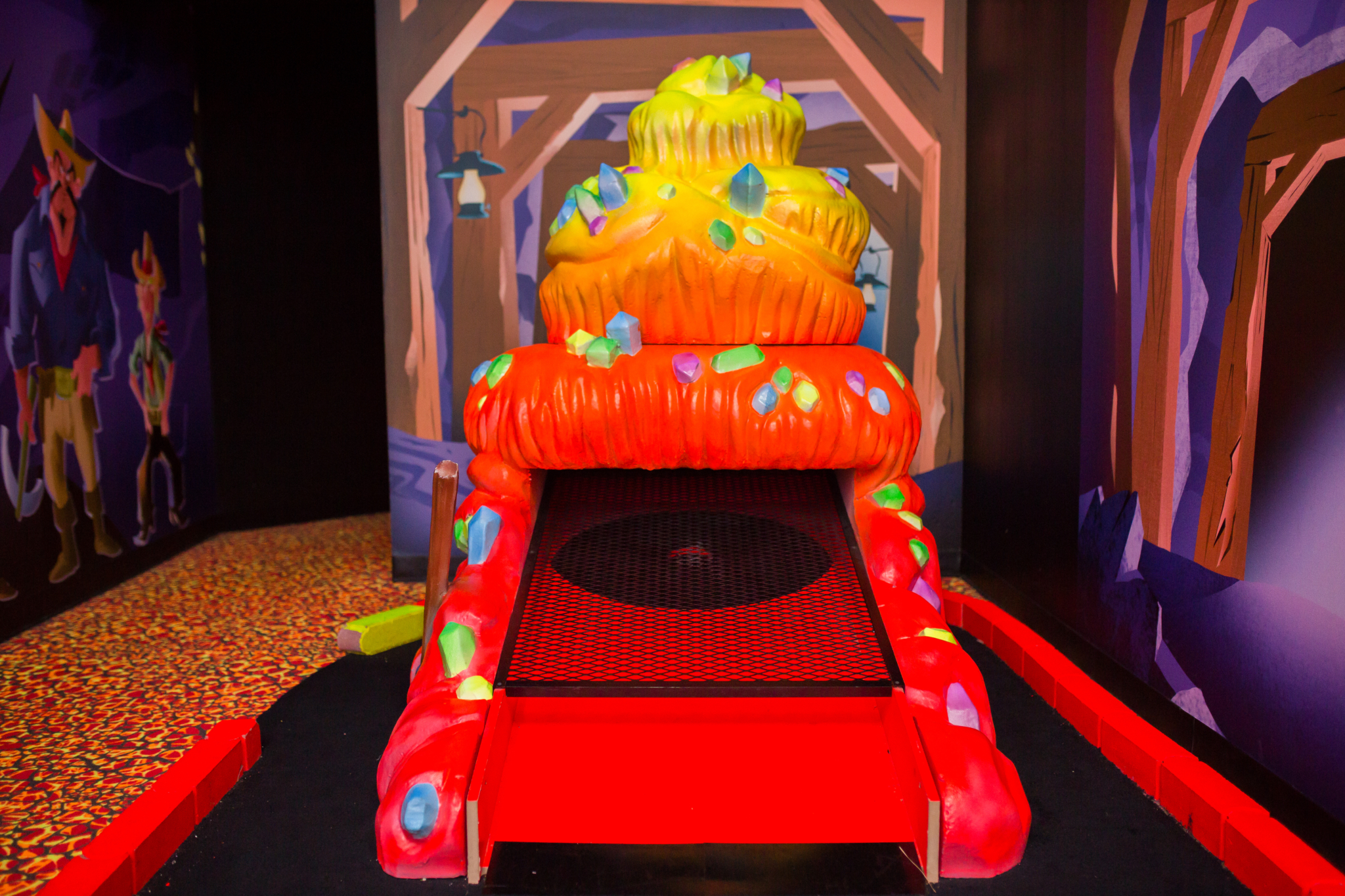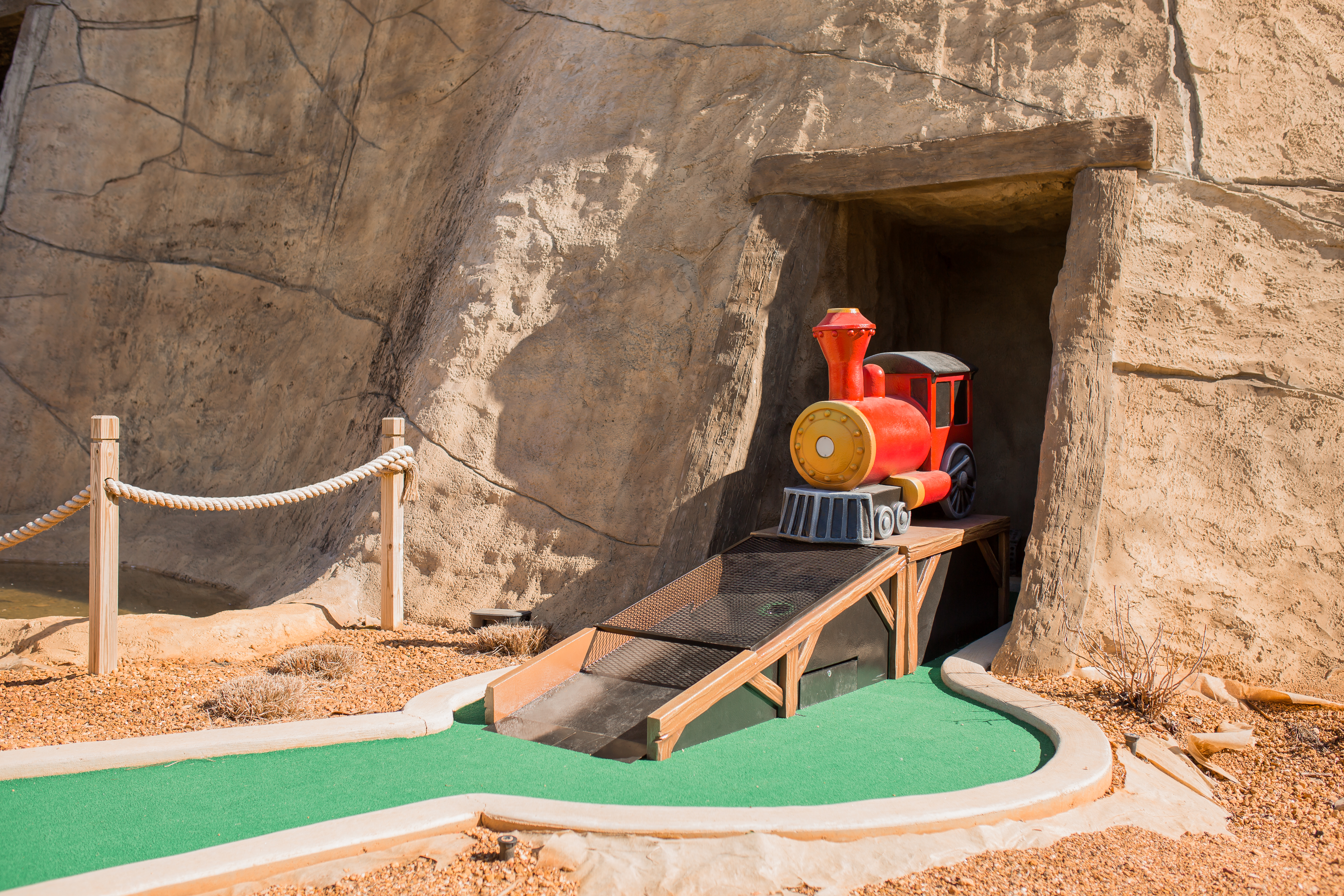 So come aboard and ride the train to challenging courses, go deep into the black-lit mines or hang out with Minor Jim in his rail car. On warm days, cool off by the spray of cascading waterfalls on Miners Mountain or simply enjoy the beautiful landscaping. On hot, rainy or cold days, your family and friends will always be comfortable inside Miner’s Mountain.